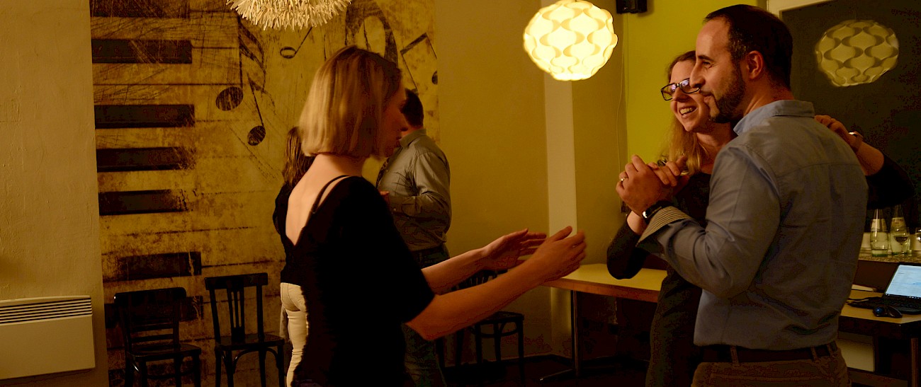 Im Anfängerkurs arbeiten wir viel an der Technik des Führens und des Gehens. Führungsimpulse zu geben und zu spüren und diese dann umzusetzen. Wir wollen eine solide tänzerische Basis schaffen, damit das Tanzen mit der Zeit anstrengungsloser wird und Genießen möglich ist.
